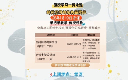 师从书籍编制者,解锁地标设计“原力” | 朗筑空间钢结构高研班1月19日开课 当你的设计作品成为城市天际线的一部分,当体育馆、交通枢纽等大型公建的复杂曲面在你的软件中成型——这不仅是技术的实现,更是结构工程师职业成就的巅峰。然而,从规范条文到实现一座安全、经济、优雅的空间钢结构,中间横亘着巨大的能力鸿沟。 朗筑空间钢结构实战设计面授班 ,正是为跨越这道鸿沟而设。2026年1月19日,我们用两周的高强度面授,直指空间结构设计的核心... 查看详细+