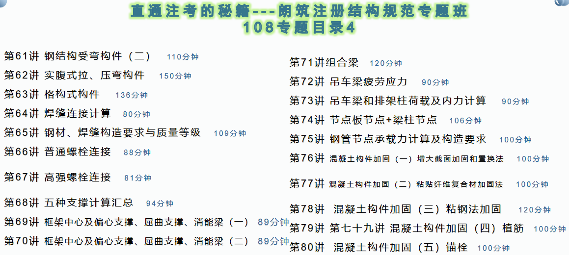 课程内容:除规范各常规考点外,我们还准备了更多专题,诸如:隔震、耗能梁、长细比、宽厚比、钢结构二阶效应与稳定性分析、组合梁、液化深度、抗震等级与抗震(构造)措施、不规则判断、性能化设计、各类刚度比、筏板基础、独立基础、条形基础、桩基规范的各类桩基础。。。。。
